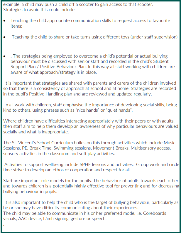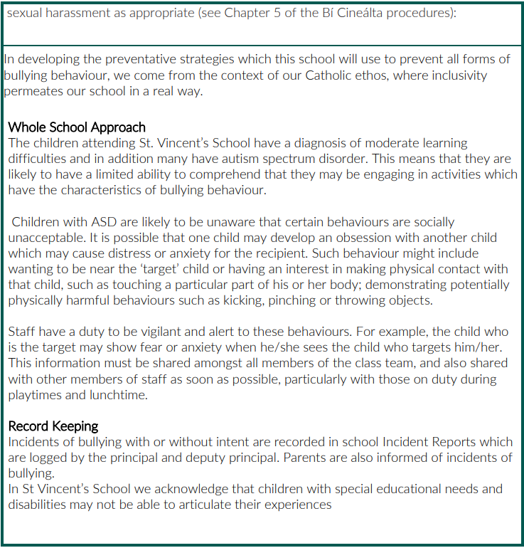 This policy sets out St Vincent’s School’s procedures for dealing with bullying. This policy should also be read in conjunction with St. Vincent’s School’s Code of Behaviour Policy. The pupils at St. Vincent’s School all have moderate learning difficulties. The nature of their disability means that children may not have sufficient understanding or awareness that certain behaviours directed towards others may be undesirable or that they might be construed as bullying. Similarly, some children who are the recipients of such behaviours may be unable to express or communicate their aversion to such behaviours or to tell adults. This means that all staff at St. Vincent’s School have a duty to not only be aware of such behaviours and of any child involved, but also to respond appropriately to instances of bullying behaviours.