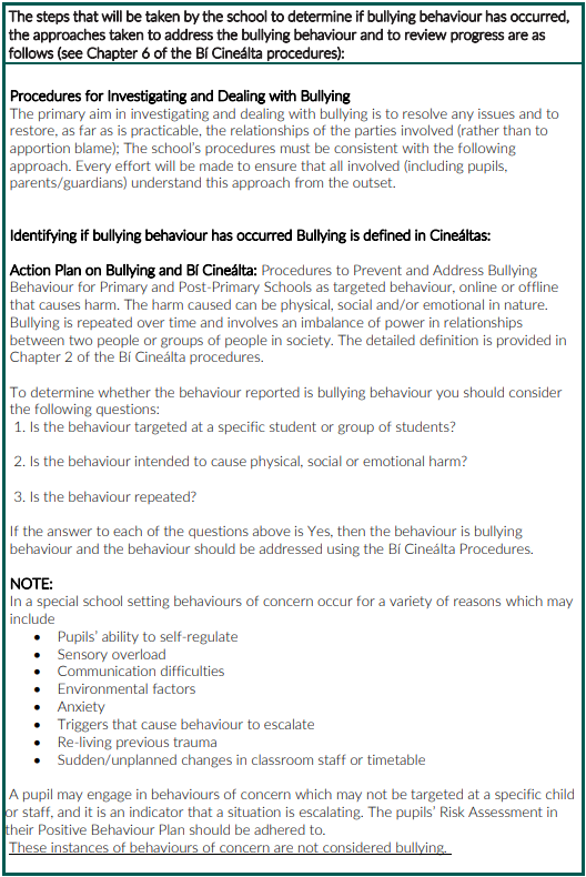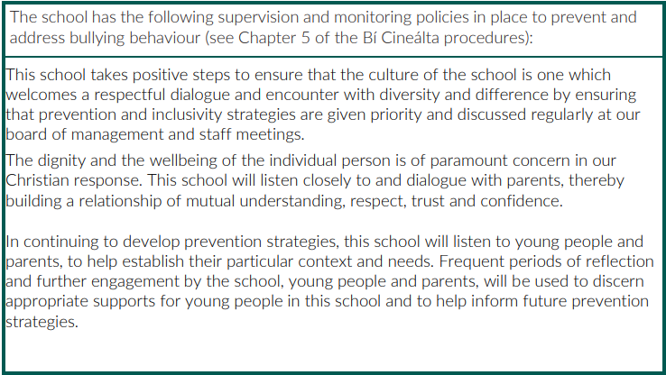 This policy fully complies with the requirements of Bí Cineálta: Procedures to Prevent and Address Bullying Behaviour for Primary and Post-Primary Schools 2024.